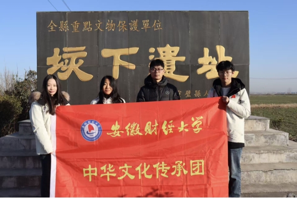 为深度探寻淮河文化脉络,解码从大汶口文化到秦汉时期的文明基因,助力地域文化传承与活化,1月11日,安徽财经大学文学院“徽韵寻根”实践团队在指导老师的带领下,赴宿州、蚌埠两地开展“垓下寻迹 问道徽韵”专项实践活动。团队先后走进灵璧县韦集镇老胡庄垓下遗迹、垓下遗址博物馆,再赴固镇垓下遗址博物馆与蚌埠市博物馆,以实地踏勘、沉浸式参观的方式触摸历史温度,在遗址遗存中感悟文明传承,用青春脚步丈量文化根脉。