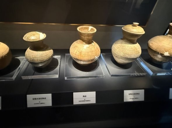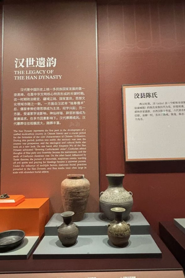 来到秦汉时期展区,文物风格愈发厚重雄浑。出土的青铜剑、铁农具、陶制生活用具,展现了秦汉大一统格局下,垓下地区农业、手工业的繁荣发展。尤其是一组汉代的陶楼模型,结构精巧、细节丰富,飞檐翘角间尽显汉代建筑的恢宏气势,印证了当时经济的昌盛与文化的繁荣。团队成员一边认真聆听讲解,一边详细记录,不时相互交流心得,在实地实践中深化对不同历史时期文化特征的理解,感受着中华文明绵延不绝的生命力。