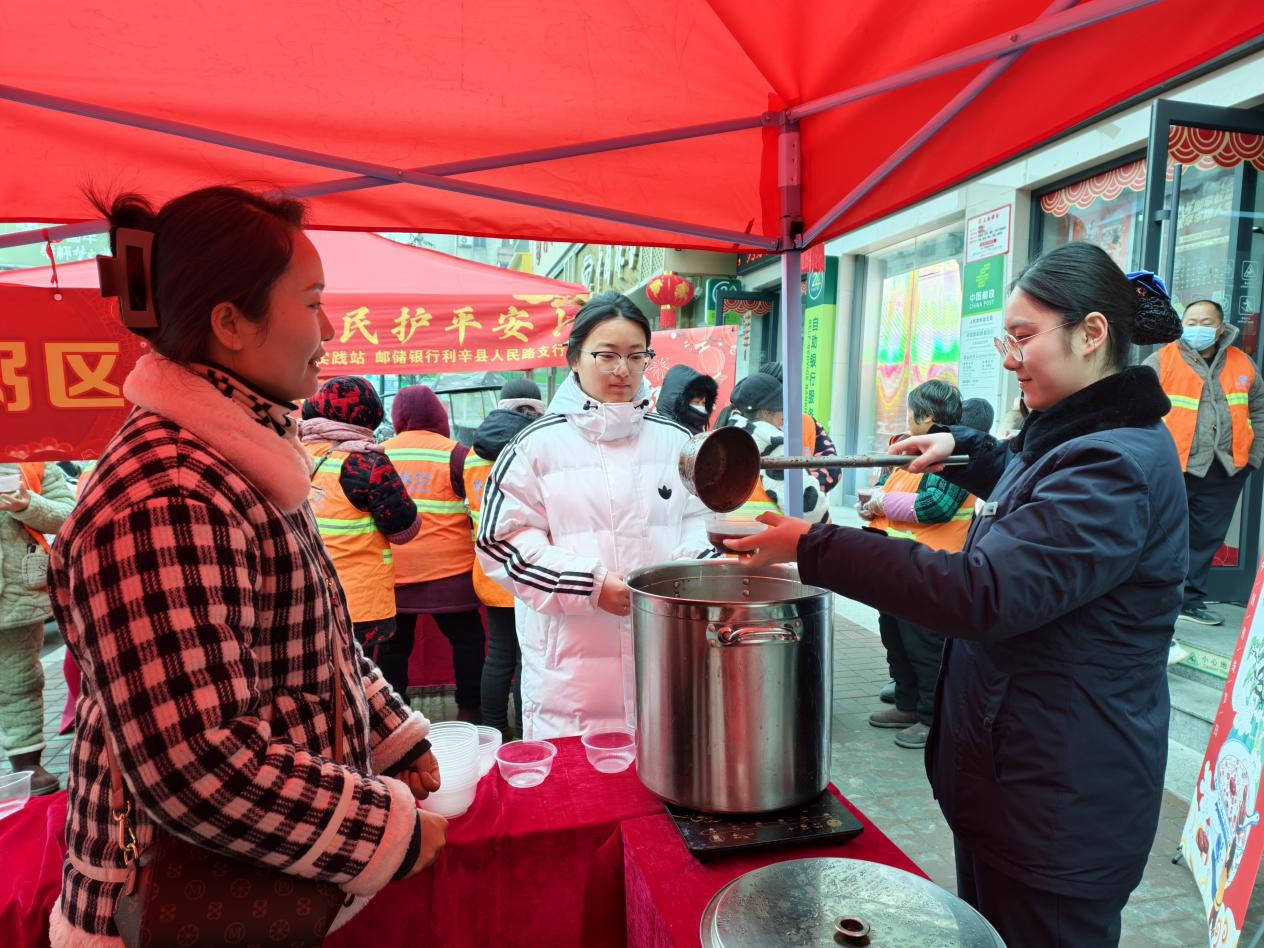 腊月初七暖冬意,粥香情浓满社区。1月25日上午,在腊八佳节来临之际,中共利辛县委社会工作部、城关镇向阳社区新时代文明实践站联合邮储银行利辛县人民路支行,共同举办“利辛邮政进社区,向阳送暖过腊八,金融便民护平安”主题活动。活动以粥为媒、以情相连,不仅为辖区30余名环卫工人及50余位居民带来了冬日暖意,更搭建起便民服务与情感沟通的桥梁,返家乡大学生志愿者的积极参与,更让传统节日的文化底蕴、公益服务的民生温度与青年担当的青春活力深度交融。