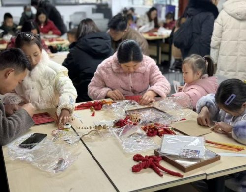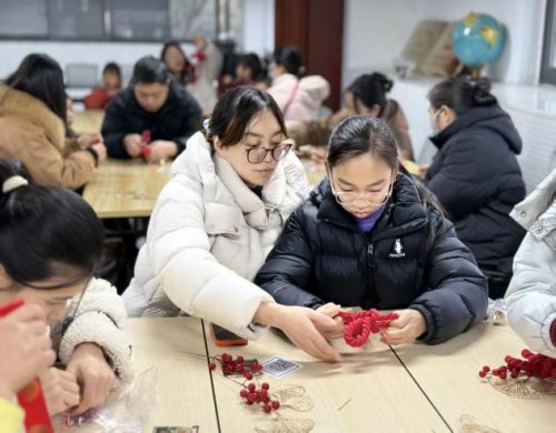 活动现场,志愿者详细讲解中国结、竹编等传统技艺的历史渊源与文化寓意:中国结承载吉祥平安寓意、竹编彰显环保理念与匠人精神。亲子家庭分工协作、默契配合,或固定材料、或精心编织,现场氛围温馨融洽。在家长的引导下,孩子们认真书写对社区长者的问候与祝福,将童真爱心融入字里行间,为即将送出的手工作品搭配专属贺卡。
